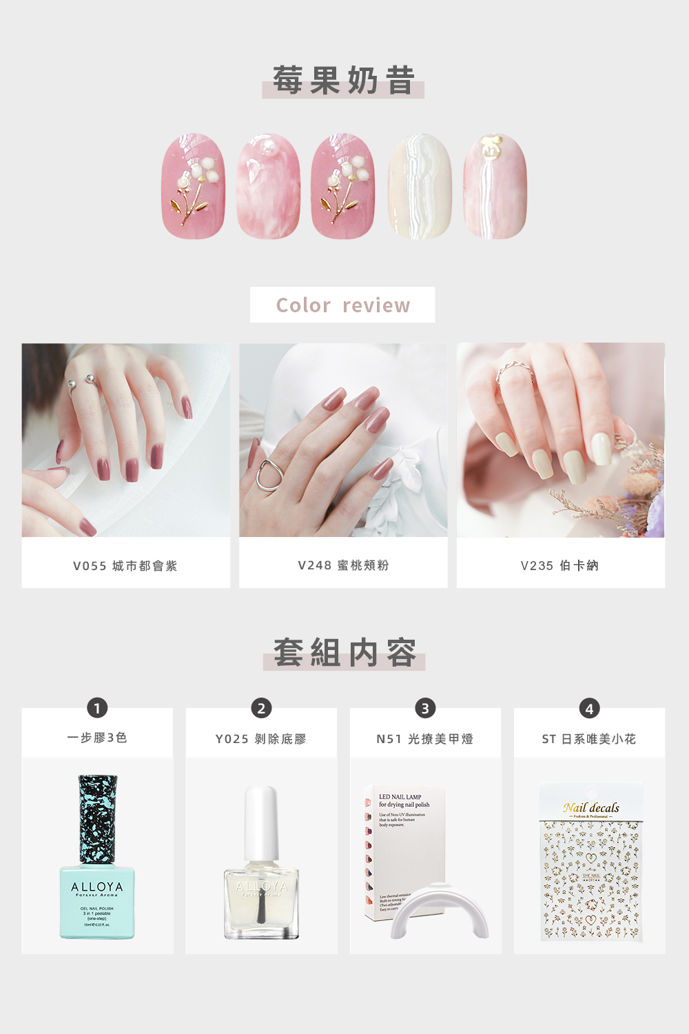 【莓果奶昔套組A V055/V248/V235/Y025/N51美甲燈】新手友善 剝除卸甲 愛若雅光撩一步膠
